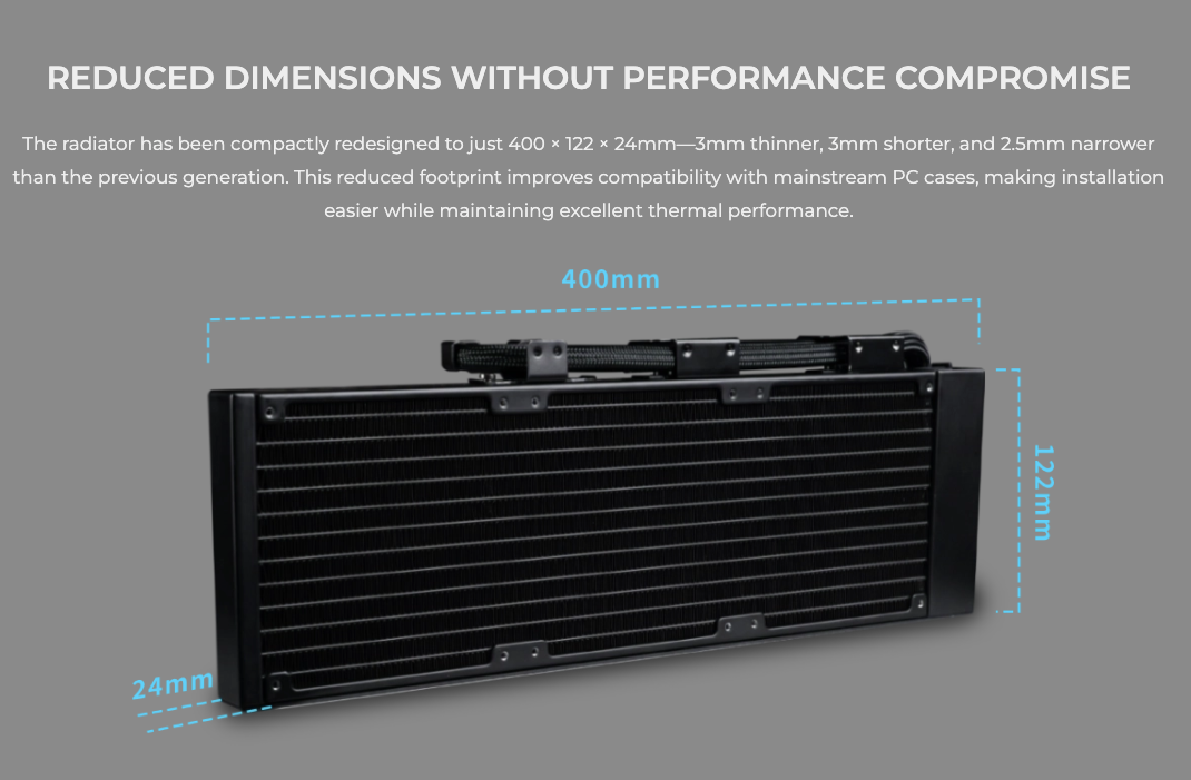 Lian Li Hydroshift II 冷排尺寸:400 × 122 (+ 管路凸起 ≈ 15 mm) × 24 mm