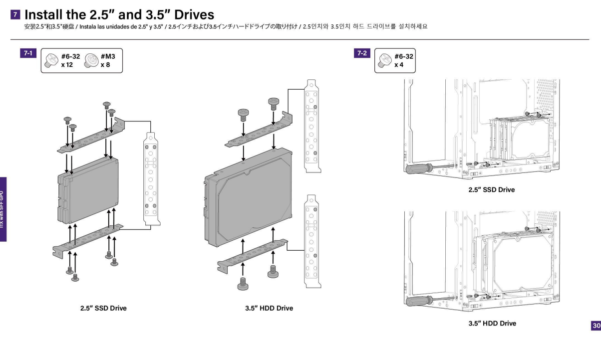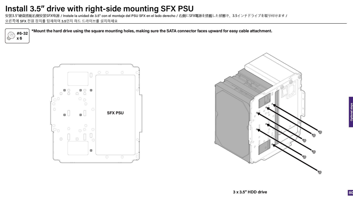 - **SFX 电源安装位**可容纳最多 3 颗 3.5" HDD,但需注意 SATA 接口朝向与电源线走线规划。