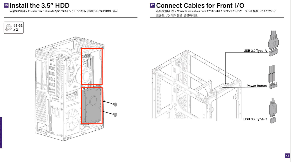 | 硬盘位置2:主板正前方区域 可再安装 2 颗 3.5" HDD,但会占用 CPU 散热器空间,且干涉内存插槽空间,建议提前评估。 | ![]()  |